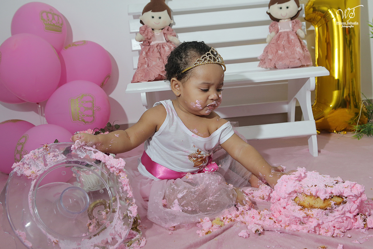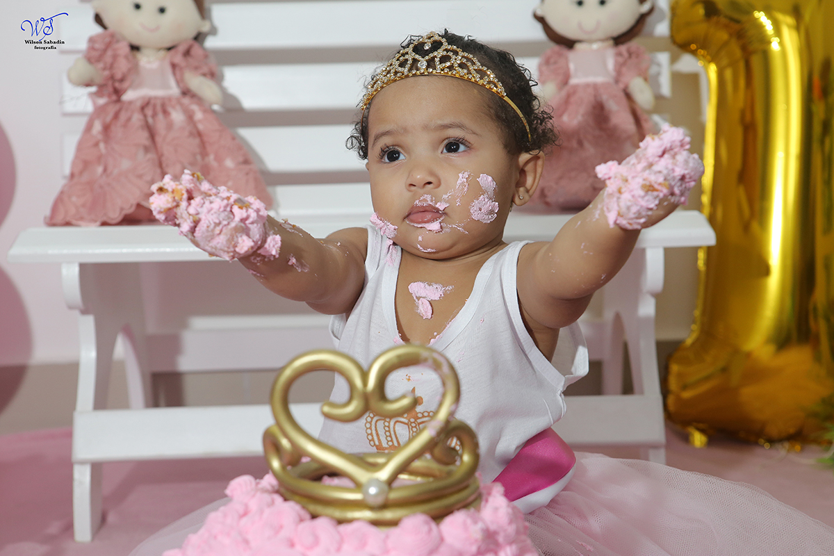 A pequena experimentando o bolo pela primeira vez foi muito engraçado, olha a bagunça que ela fez, pelo jeito estava uma delícia. A princípio não quis se sujar, mas em instantes até os pés ficaram sujos e ainda destruiu o bolo.